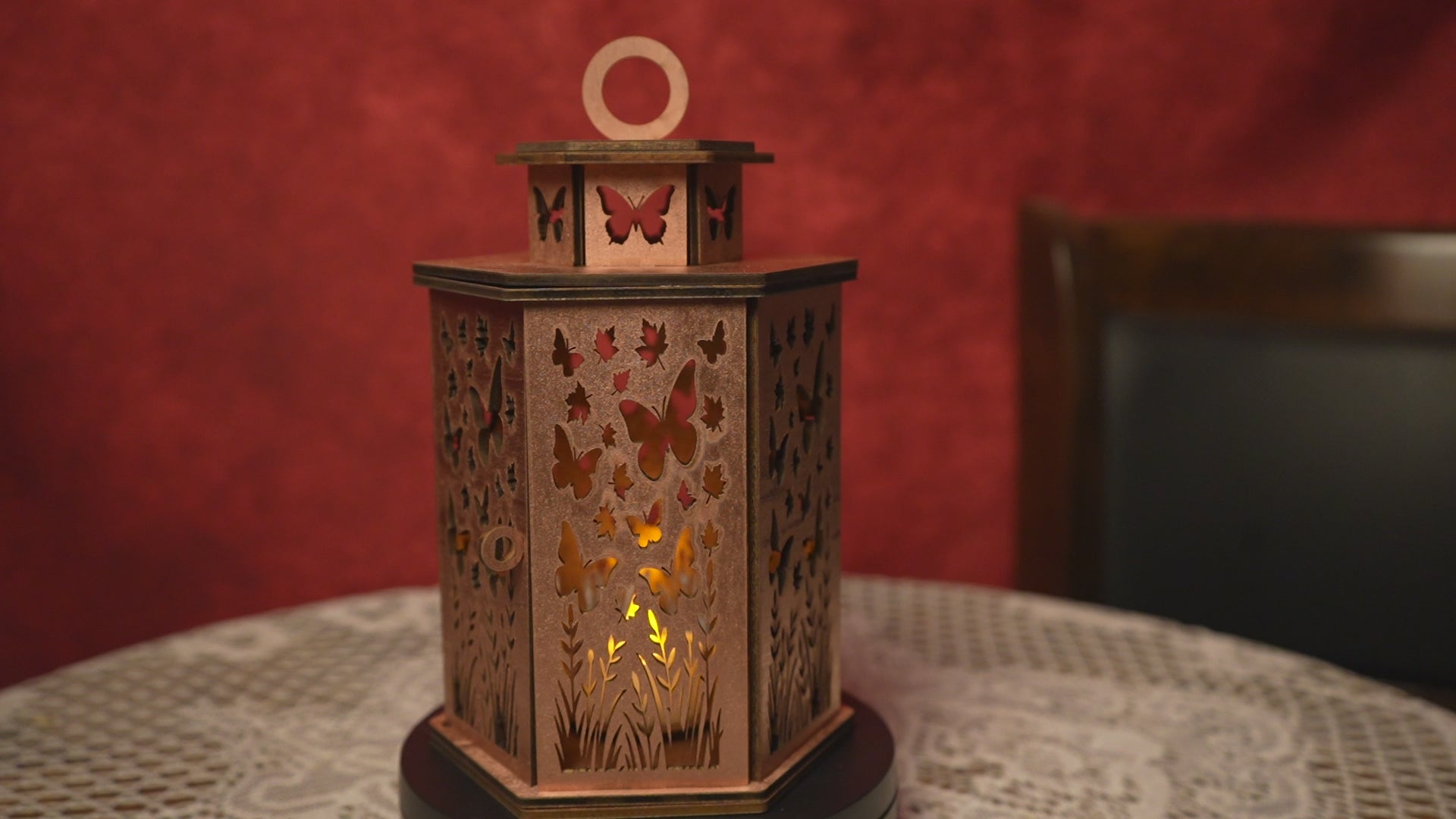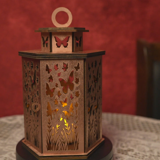 Crafted from 1/8" basswood with a warm copper finish, this 8" tall butterfly lantern captures the fleeting magic of fall. Delicate butterflies drift among swirling leaves, evoking the quiet beauty of seasonal change and the gentle passage of time. The soft glow of the included LED tea light brings the scene to life—casting dancing shadows and golden warmth through every intricately cut panel. Measuring 5" wide at the base, it's a perfect accent for cozy evenings, thoughtful gifts, or moments of reflection. Let nature’s transformation light your way.
