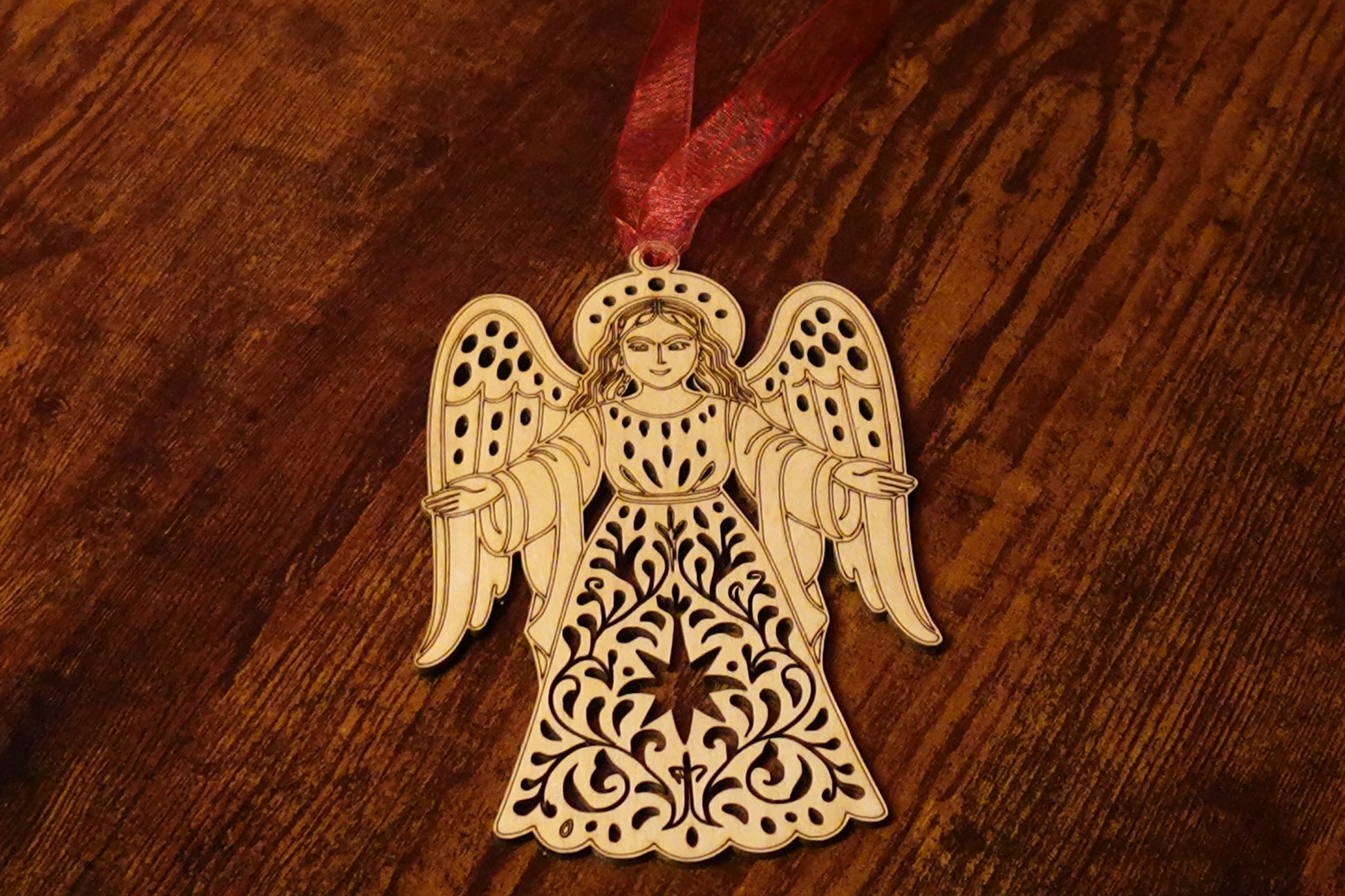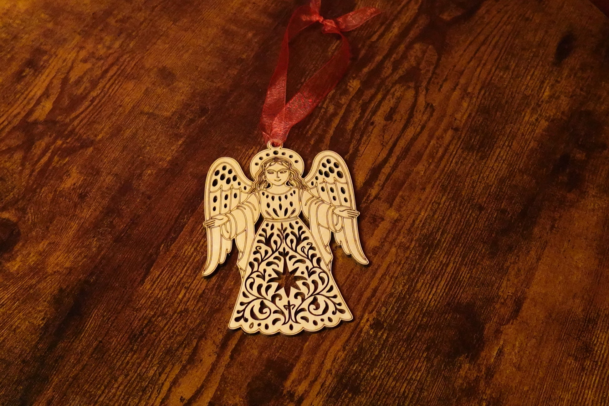 Crafted from fine Baltic Birch, the Heavenly Angel Christmas Ornament stands 5 7/8" tall and 3 3/4" wide. Its elegant design suits both as a refined holiday gift and a tasteful addition to your Christmas tree or window décor, bringing subtle grace and seasonal charm to your home.